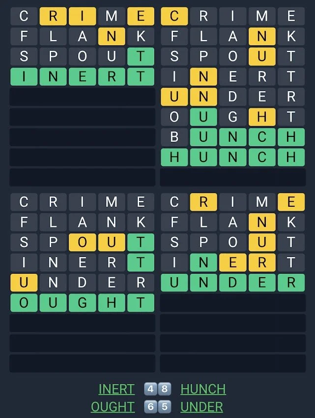In Quordle, you’re solving 4 Wordle puzzles at the same time, and while it seems daunting at first, it ends up being more satisfying in my opinion since you can be more strategic about how you balance safety & information gathering with bravery & guessing words outright.