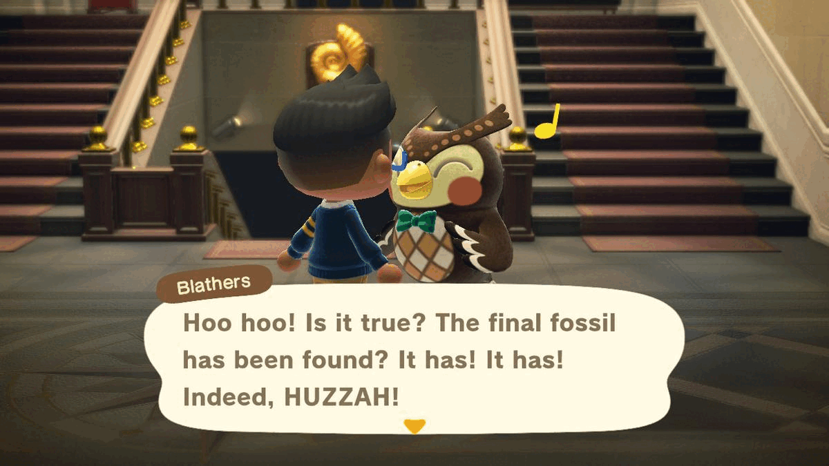 I made Blathers happy by completing the fossil, bug, and fish collections: